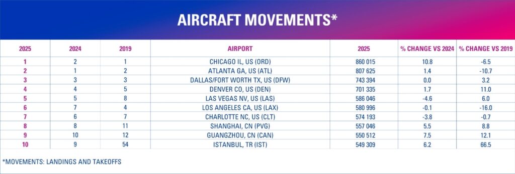 O Aeroporto Internacional Hartsfield-Jackson Atlanta continua sendo o aeroporto mais movimentado do mundo para o tráfego de passageiros, seguido pelo Aeroporto Internacional de Dubai e pelo Aeroporto Haneda de Tóquio. Ao mesmo tempo, o Aeroporto Internacional O’Hare de Chicago ocupa o primeiro lugar em movimentos de aeronaves.