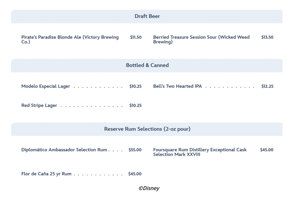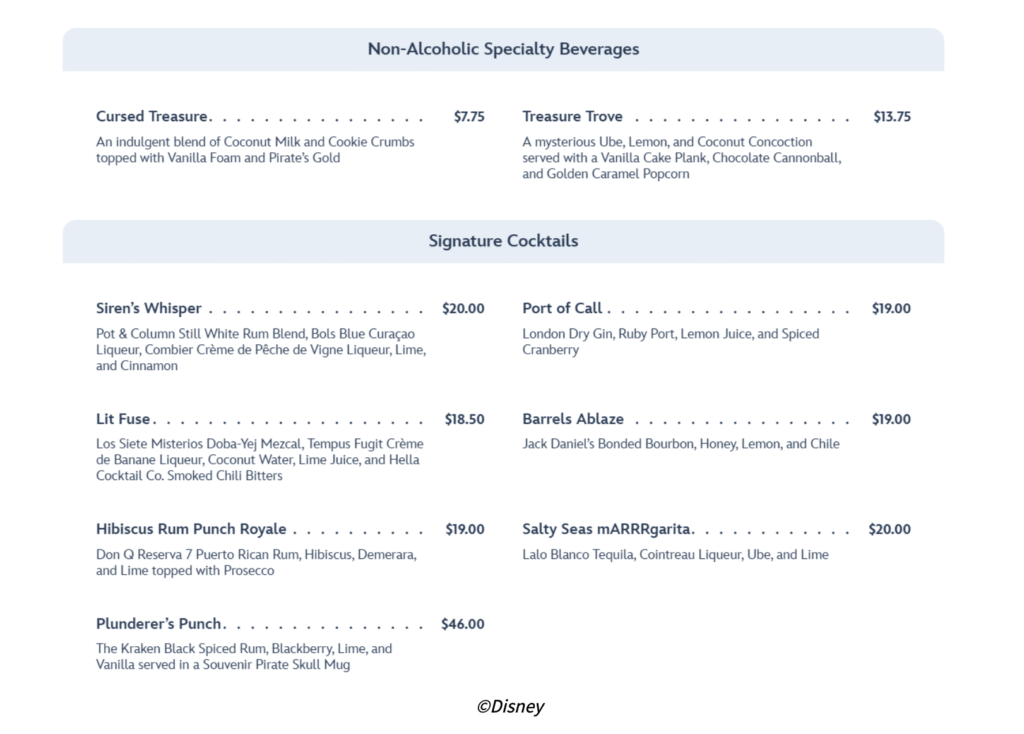 • Salty Seas mARRRgarita, Siren’s Whisper, Hibiscus Rum Punch Royale, Plunderer’s Punch (US$ 46, servido em caneca caveira colecionável).